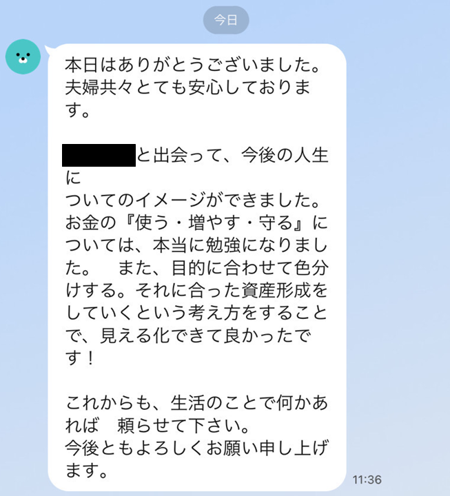 20代男性から嬉しいお言葉をいただきました。ファイナンシャルプランナーとしてこのようなお言葉をいただけることがとてもやりがいにつながります。